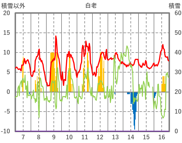 | 日 | 時 | 気温 | 降水 | 風向/風速 | 日照 | 積雪 | 降雪 |