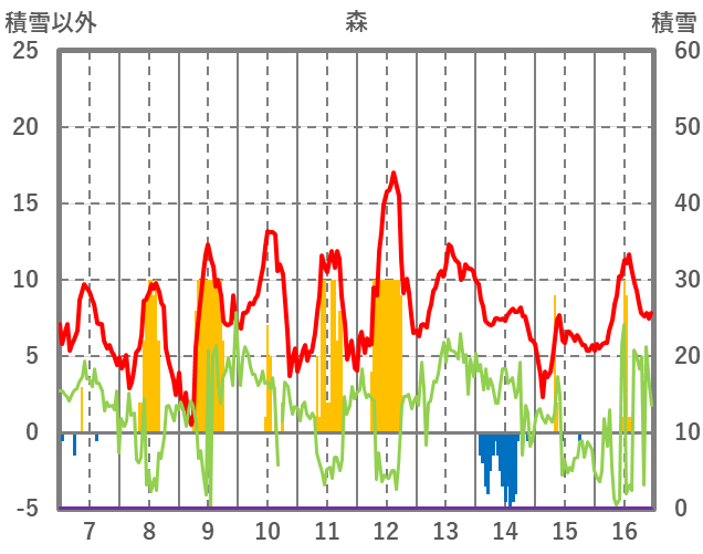 | 日 | 時 | 気温 | 降水 | 風向/風速 | 日照 | 積雪 | 降雪 |