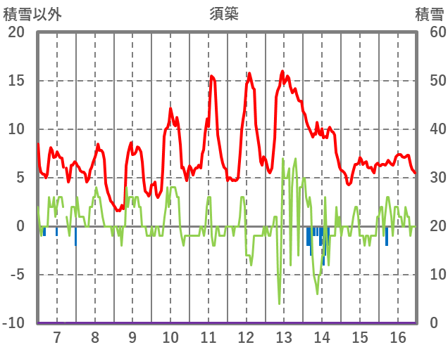 | 日 | 時 | 気温 | 降水 | 風向/風速 | 日照 | 積雪 | 降雪 |