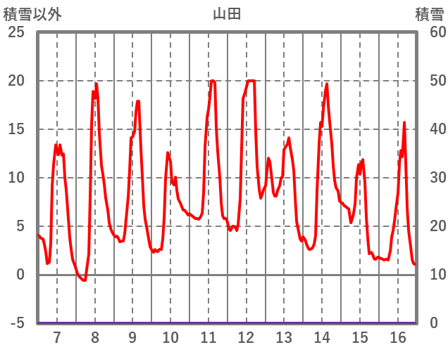 | 日 | 時 | 気温 | 降水 | 風向/風速 | 日照 | 積雪 | 降雪 |