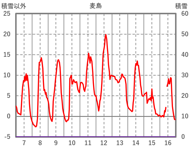 | 日 | 時 | 気温 | 降水 | 風向/風速 | 日照 | 積雪 | 降雪 |