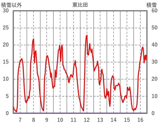 | 日 | 時 | 気温 | 降水 | 風向/風速 | 日照 | 積雪 | 降雪 |