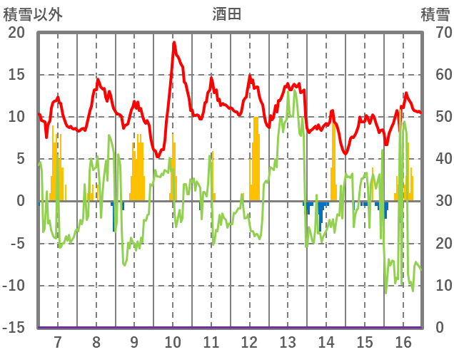 | 日 | 時 | 気温 | 降水 | 風向/風速 | 日照 | 積雪 | 降雪 |