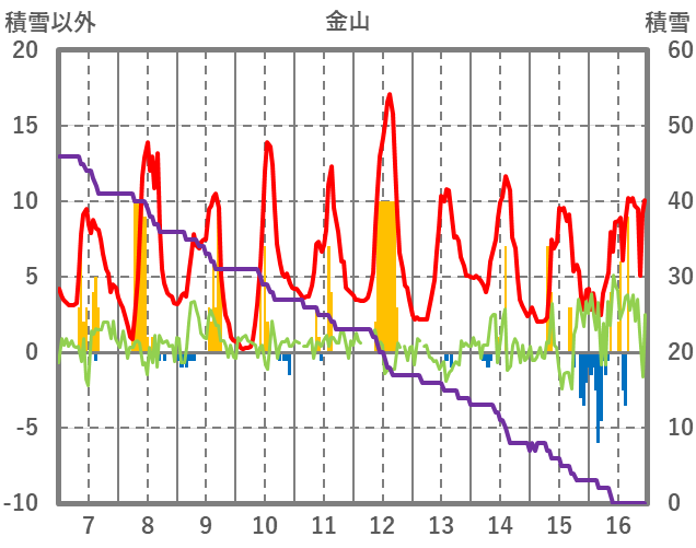 | 日 | 時 | 気温 | 降水 | 風向/風速 | 日照 | 積雪 | 降雪 |