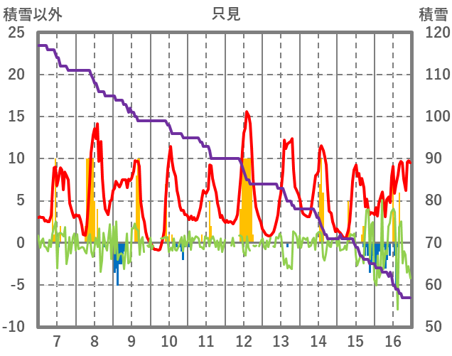 | 日 | 時 | 気温 | 降水 | 風向/風速 | 日照 | 積雪 | 降雪 |
