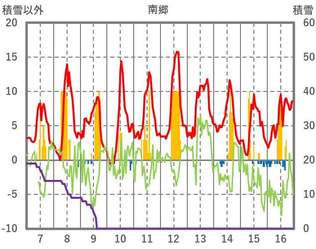 | 日 | 時 | 気温 | 降水 | 風向/風速 | 日照 | 積雪 | 降雪 |