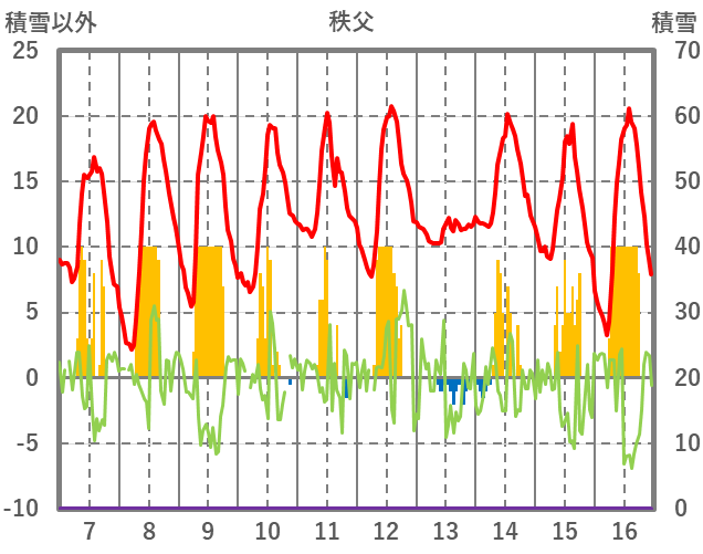 | 日 | 時 | 気温 | 降水 | 風向/風速 | 日照 | 積雪 | 降雪 |