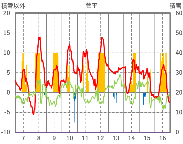 | 日 | 時 | 気温 | 降水 | 風向/風速 | 日照 | 積雪 | 降雪 |