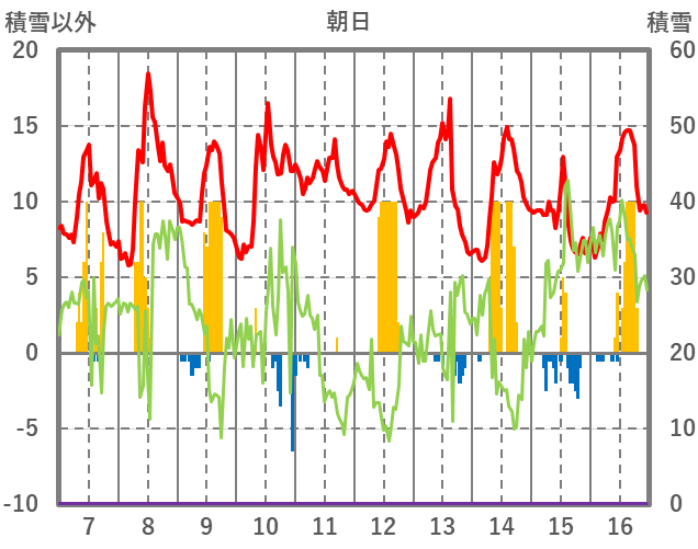 | 日 | 時 | 気温 | 降水 | 風向/風速 | 日照 | 積雪 | 降雪 |