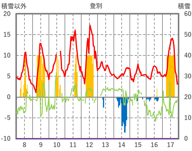 | 日 | 時 | 気温 | 降水 | 風向/風速 | 日照 | 積雪 | 降雪 |