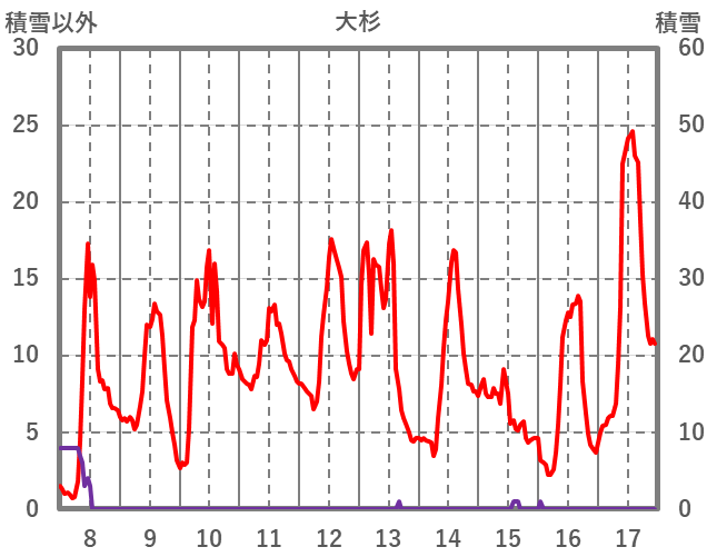 | 日 | 時 | 気温 | 降水 | 風向/風速 | 日照 | 積雪 | 降雪 |