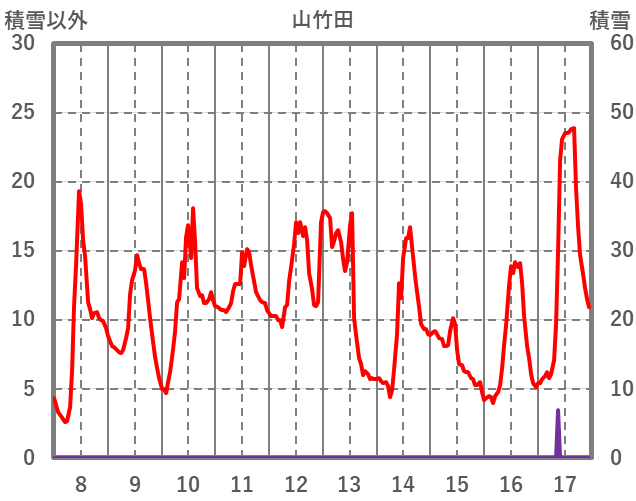 | 日 | 時 | 気温 | 降水 | 風向/風速 | 日照 | 積雪 | 降雪 |