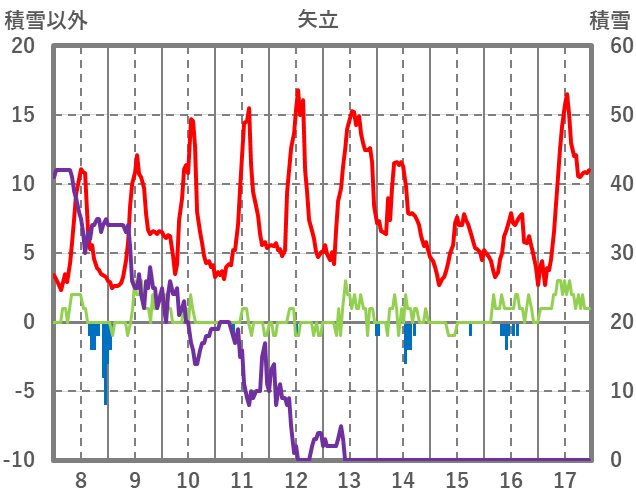| 日 | 時 | 気温 | 降水 | 風向/風速 | 日照 | 積雪 | 降雪 |