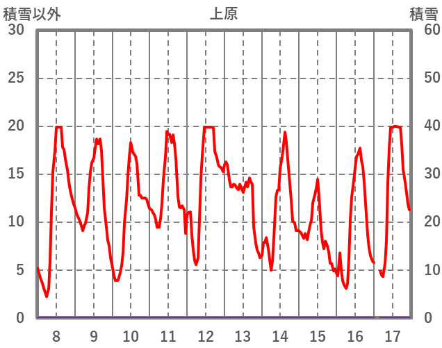 | 日 | 時 | 気温 | 降水 | 風向/風速 | 日照 | 積雪 | 降雪 |