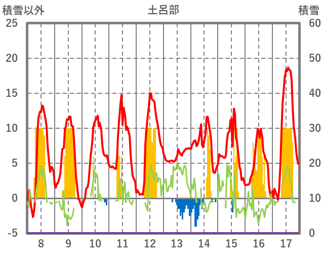 | 日 | 時 | 気温 | 降水 | 風向/風速 | 日照 | 積雪 | 降雪 |