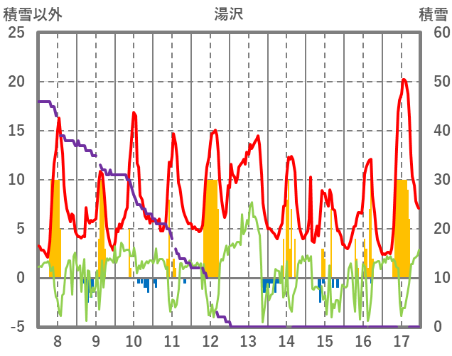 | 日 | 時 | 気温 | 降水 | 風向/風速 | 日照 | 積雪 | 降雪 |