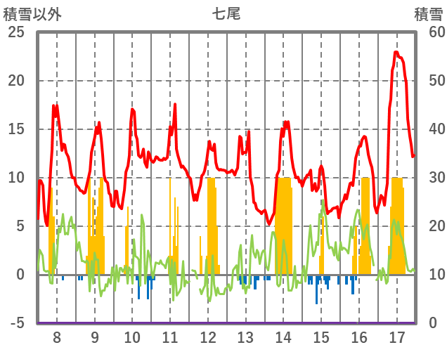| 日 | 時 | 気温 | 降水 | 風向/風速 | 日照 | 積雪 | 降雪 |