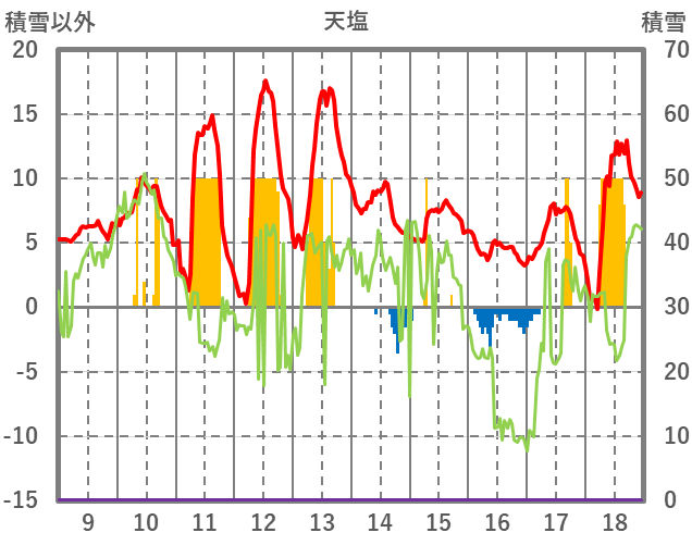| 日 | 時 | 気温 | 降水 | 風向/風速 | 日照 | 積雪 | 降雪 |
