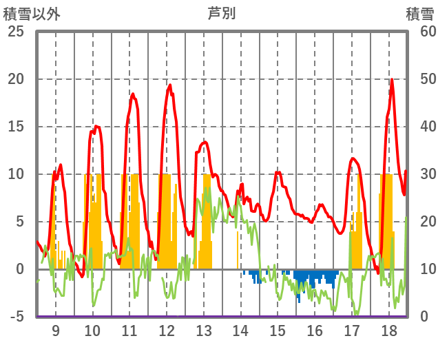 | 日 | 時 | 気温 | 降水 | 風向/風速 | 日照 | 積雪 | 降雪 |