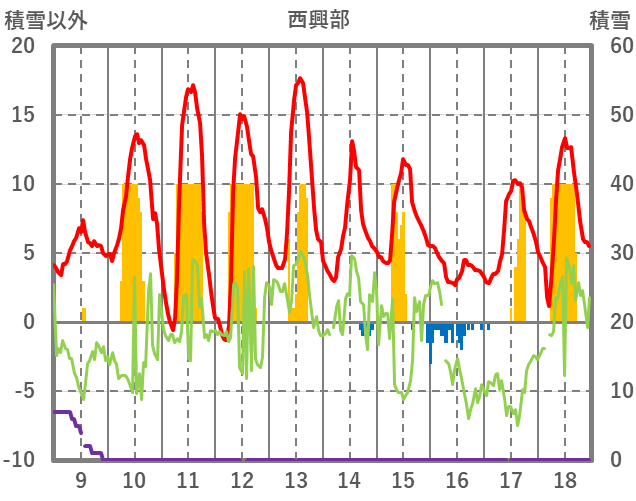 | 日 | 時 | 気温 | 降水 | 風向/風速 | 日照 | 積雪 | 降雪 |
