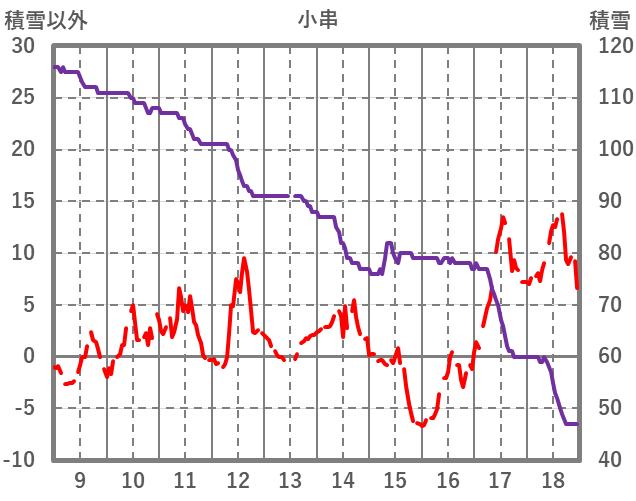 | 日 | 時 | 気温 | 降水 | 風向/風速 | 日照 | 積雪 | 降雪 |