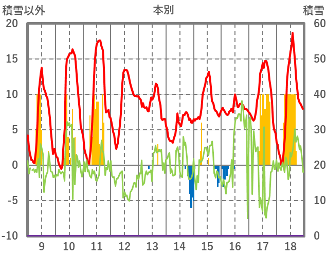 | 日 | 時 | 気温 | 降水 | 風向/風速 | 日照 | 積雪 | 降雪 |