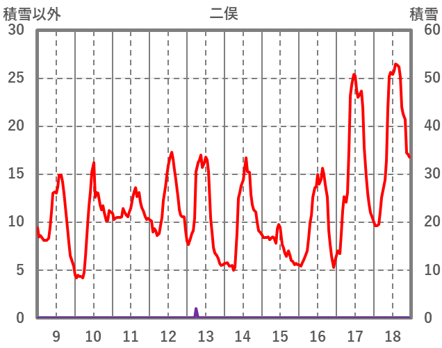 | 日 | 時 | 気温 | 降水 | 風向/風速 | 日照 | 積雪 | 降雪 |