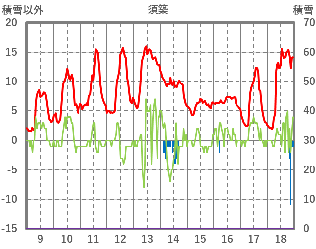 | 日 | 時 | 気温 | 降水 | 風向/風速 | 日照 | 積雪 | 降雪 |