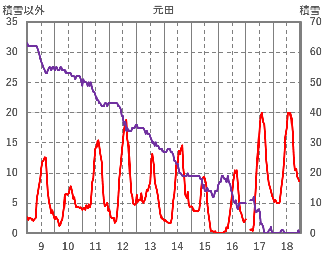 | 日 | 時 | 気温 | 降水 | 風向/風速 | 日照 | 積雪 | 降雪 |