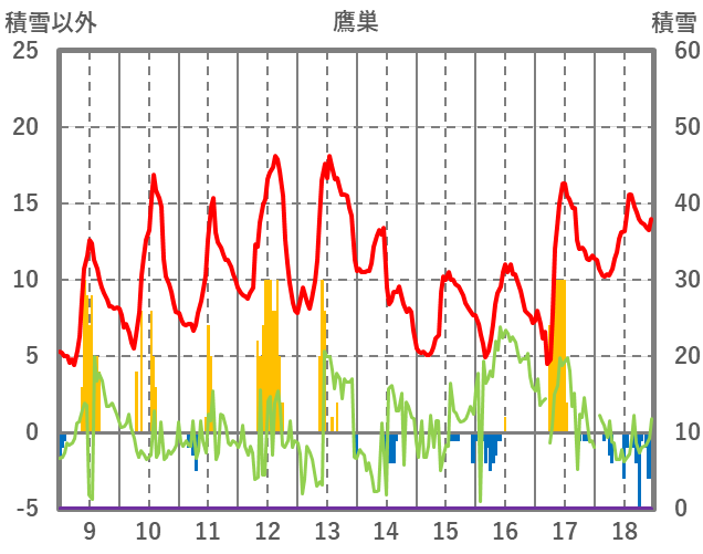 | 日 | 時 | 気温 | 降水 | 風向/風速 | 日照 | 積雪 | 降雪 |