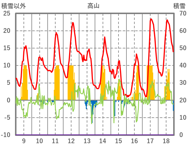 | 日 | 時 | 気温 | 降水 | 風向/風速 | 日照 | 積雪 | 降雪 |