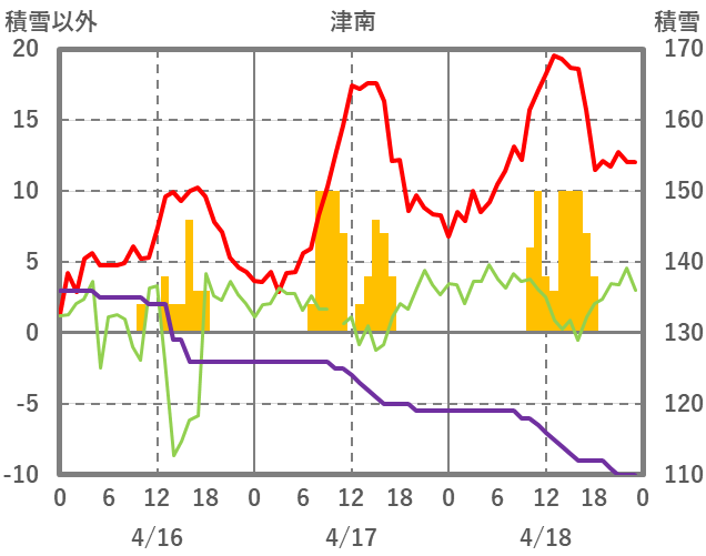 | 日 | 時 | 気温 | 降水 | 風向/風速 | 日照 | 積雪 | 降雪 |