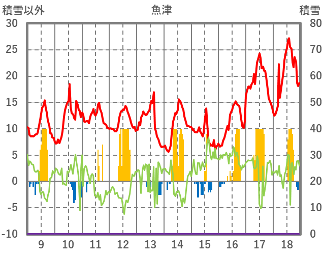 | 日 | 時 | 気温 | 降水 | 風向/風速 | 日照 | 積雪 | 降雪 |