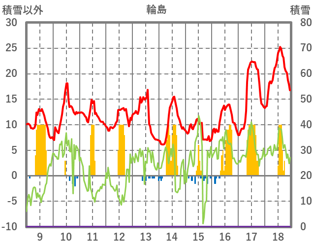 | 日 | 時 | 気温 | 降水 | 風向/風速 | 日照 | 積雪 | 降雪 |