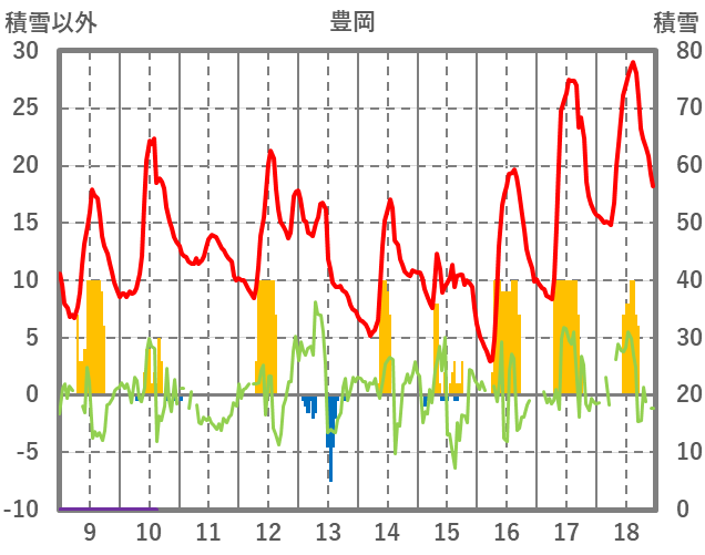 | 日 | 時 | 気温 | 降水 | 風向/風速 | 日照 | 積雪 | 降雪 |