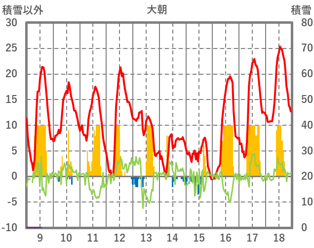 | 日 | 時 | 気温 | 降水 | 風向/風速 | 日照 | 積雪 | 降雪 |