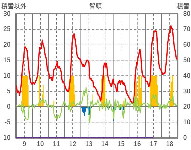 | 日 | 時 | 気温 | 降水 | 風向/風速 | 日照 | 積雪 | 降雪 |