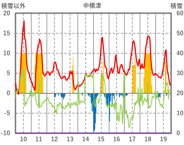 | 日 | 時 | 気温 | 降水 | 風向/風速 | 日照 | 積雪 | 降雪 |