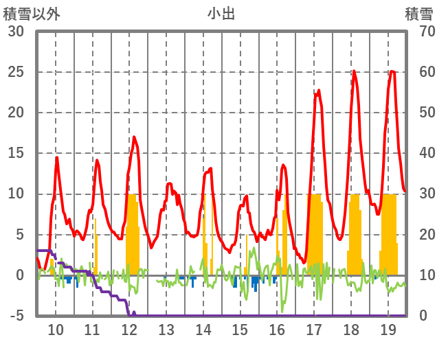 | 日 | 時 | 気温 | 降水 | 風向/風速 | 日照 | 積雪 | 降雪 |
