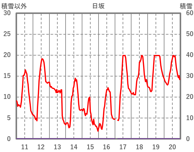 | 日 | 時 | 気温 | 降水 | 風向/風速 | 日照 | 積雪 | 降雪 |