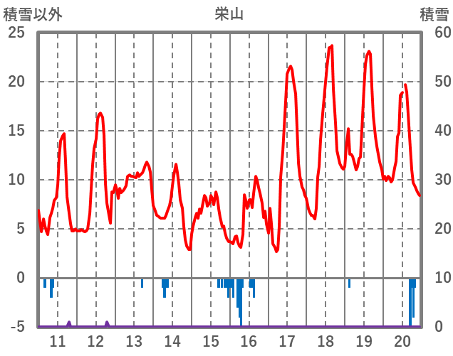 | 日 | 時 | 気温 | 降水 | 風向/風速 | 日照 | 積雪 | 降雪 |