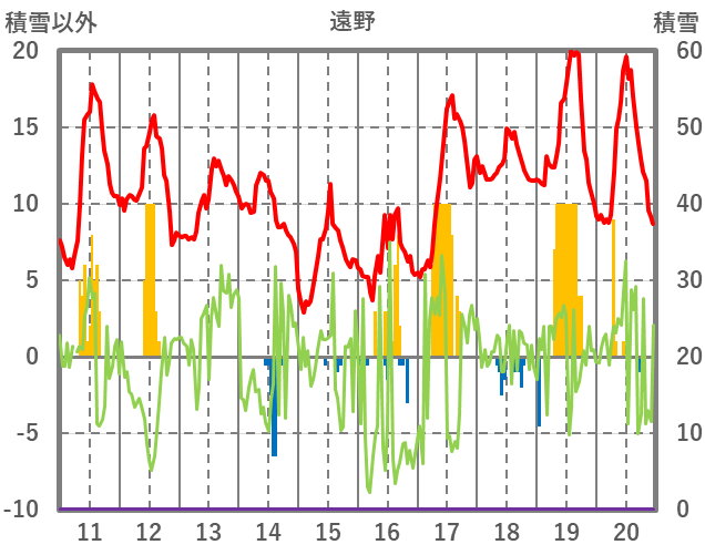 | 日 | 時 | 気温 | 降水 | 風向/風速 | 日照 | 積雪 | 降雪 |
