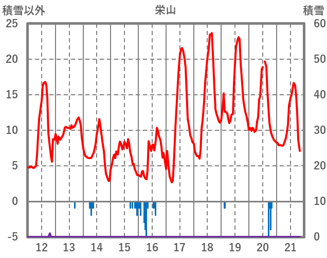 | 日 | 時 | 気温 | 降水 | 風向/風速 | 日照 | 積雪 | 降雪 |