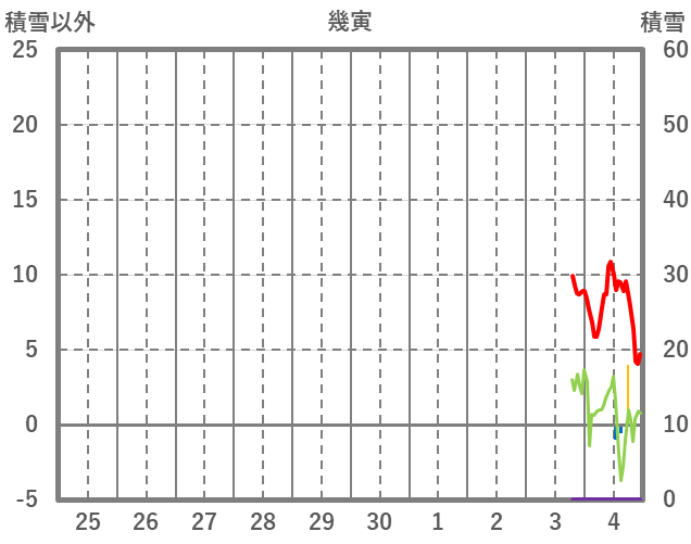 | 日 | 時 | 気温 | 降水 | 風向/風速 | 日照 | 積雪 | 降雪 |