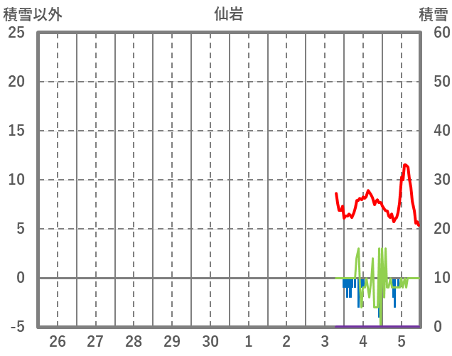 | 日 | 時 | 気温 | 降水 | 風向/風速 | 日照 | 積雪 | 降雪 |