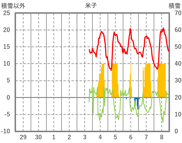 | 日 | 時 | 気温 | 降水 | 風向/風速 | 日照 | 積雪 | 降雪 |