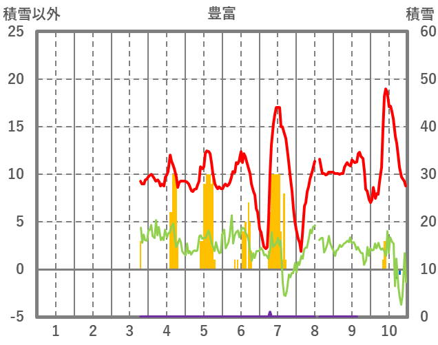 | 日 | 時 | 気温 | 降水 | 風向/風速 | 日照 | 積雪 | 降雪 |