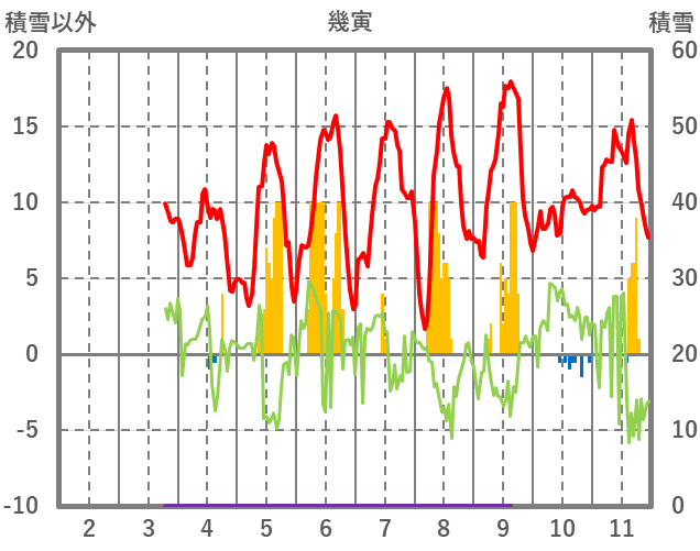 | 日 | 時 | 気温 | 降水 | 風向/風速 | 日照 | 積雪 | 降雪 |