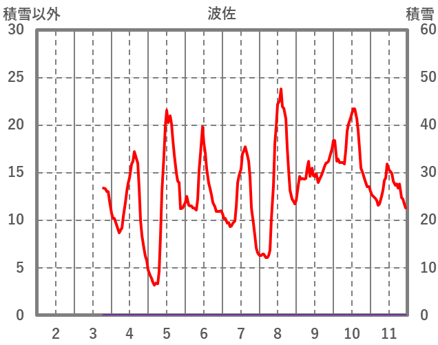 | 日 | 時 | 気温 | 降水 | 風向/風速 | 日照 | 積雪 | 降雪 |