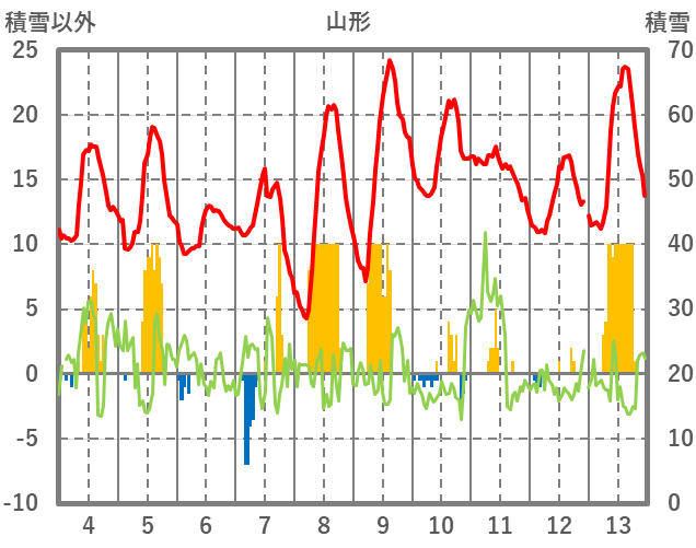 | 日 | 時 | 気温 | 降水 | 風向/風速 | 日照 | 積雪 | 降雪 |